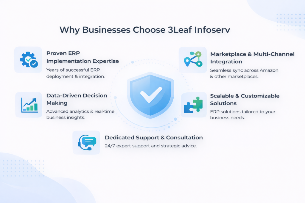 3Leaf Infoserv (OPC) Pvt. Ltd is a technology-driven company specializing in ERP implementation, eCommerce solutions, and Amazon marketplace management. We help businesses streamline operations, automate processes, and scale revenue through integrated digital systems and performance-focused strategies.